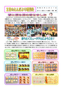 NEWS 96 園だより 令和8年2月27日「2月のえんだより増刊号」発刊しました 2026.02.27 「園だより増刊号」は、お子様の活躍の様子や園の様子を保護者様に伝えるため、定期的に作成して配布しています。 保護者様に配布しているものと同様のものです。 また、個人情報保護の為、当ホームページでは氏名や写 真を加工していますことをご了承ください。 Tweet Share Hatena Pocket RSS feedly Pin it この記事のタイトルとURLをコピーする 令和8年1月30日「1月のえんだより増刊号」発刊しました 前の記事